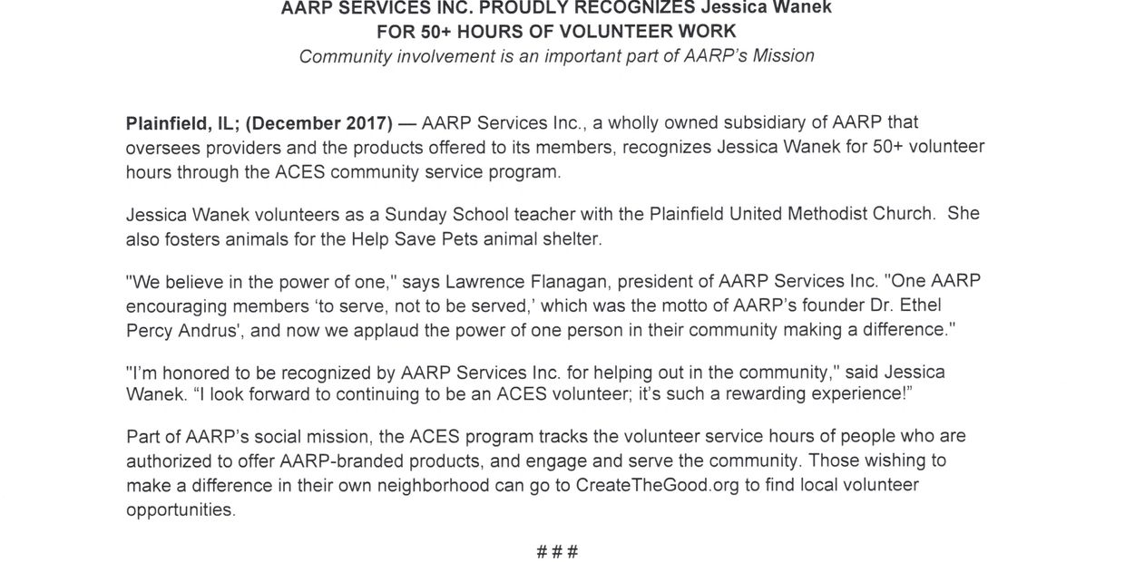 We are excited to share that AARP has awarded Jessica Wanek a Certificate of Achievement for her continued service to her community.